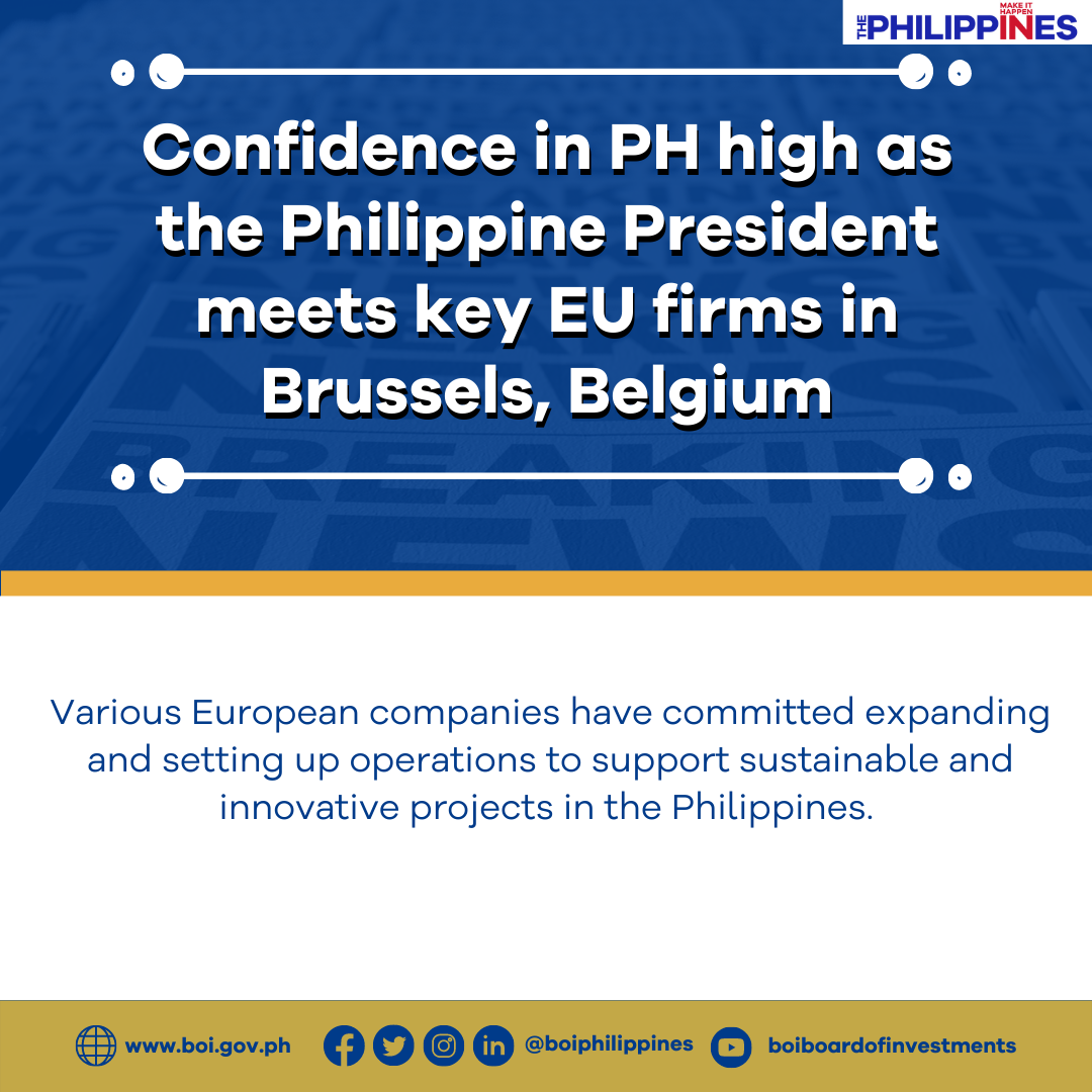 President Ferdinand Marcos Jr. had this to report upon return from Brussels, Belgium, where at the sidelines of the 10th ASEAN-EU Business Summit, he addressed Philippines-European Union Business Roundtable and met with several European companies. The event was organized by the Department of Trade Industry,Philippine Trade & Investment Center, Foreign Trade Service Corps and the Board of Investments.